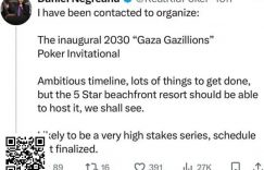 【EV扑克(www.evp89.com)报道】最近,丹牛在社交媒体发的一个帖子中的用词引发众怒。贴子里提到有人让他组织一场在巴勒斯坦举办的高额桌扑克系列赛,然后他使用了“Gaza Gazillions”这个词。