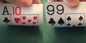 在不利位置拿着一手可能是最好牌也可能被碾压的牌,你的良好选择是check-call,或者下个小注。下注是相当强的行动,因为当你check并面对一个下注时,若对手的玩法是平衡的,他的决定将是不偏不倚的,这导致你平均而言赚不到任何底池权益。