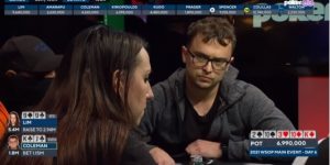 转牌A♣落下,一个巨大的底池此时正在酝酿。毒王问曹睿还有多少筹码,他回答说:“不到40万欧”,此时的底池为33.5万欧。得到答案后,毒王又将€160,000投入底池,而曹睿在经过深思熟虑后选择了跟注。