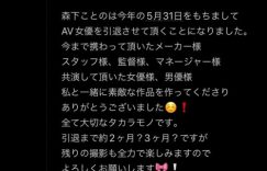 最近引退的女优真不少。经纪公司ACT所属、出道前是在童装店打工的森下ことの(森下琴乃)是在三八妇女节的当天宣布将会在5月31日引退,没有写理由,只说感谢一起合作过的片商、工作人员、导演以及男优,接下来的作品她会全力拍好拍满,请大家多多指指⋯