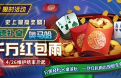 【EV扑克(www.evp68.com)报道】活动内容4/26维护结束后起,参与德州扑克/奥马哈现金桌任一级别游戏,将有高达千万红包雨随时掉落!