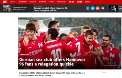 ▲德國漢諾威一間夜店,因為當地足球隊戰績不佳,將在本賽季最後一戰推出性愛趴,讓當地球迷「來一次高潮」。(圖/翻攝自AS English)國際中心/綜合報導隸屬德國足球甲級聯賽的球隊「漢諾威」(Hannover),這個賽季戰績不佳,讓球迷失望不已。當地一間色情夜店,為了要舒緩球迷失落的情緒,將在球隊本季的最後一戰,推出「性愛派對」的活動,讓球迷也能享受活動的高潮。根據《AS English》報導,漢諾威在5月14日將遇到強隊「拜仁慕尼黑(Bayern München)」,若是輸球這場比賽極有可能是漢諾威這個賽季的最後一戰。當地的知名情色夜店「FKK Villa」,推出了一場性愛趴活動,當天客人只要付96歐元(約3千8百元台幣)入場費,除了可暢飲店內所有酒精類的飲品外,還可以和店內的任何一名女服務生,來一場15分鐘性愛快餐。這間情色夜店聲稱,「至少要讓漢諾威的球迷在賽季結束前有一次高潮。」在德國嫖妓是合法的。