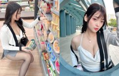 今天中午吃什麼呢?還沒有想法的人就跟著「露露咪」一起去便利商店挑一碗吧!來到泡麵的成列架前,她蹲下露出一雙套著黑絲襪的美腿,稚嫩的蜜大腿就快從短裙下露出屁股蛋,上衣還露出一條深美的事業線,讓所有客人都想靠上去用上帝視角好好養眼一番! (